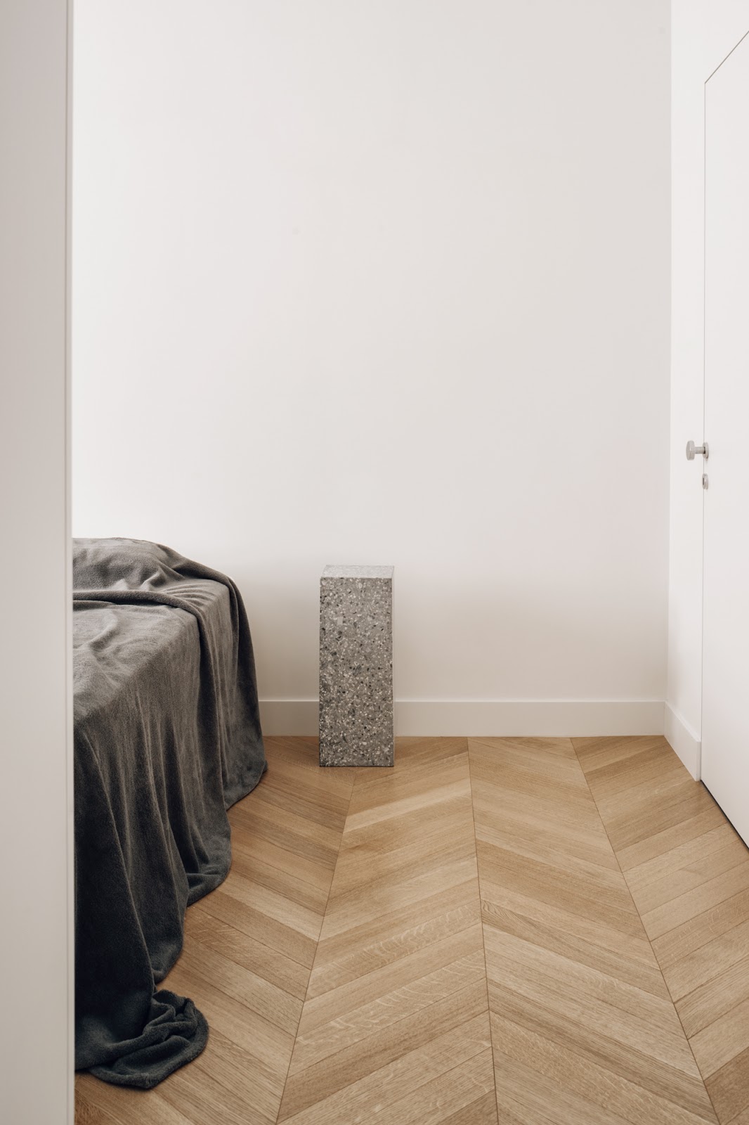 All rooms are provided with chevron hardwood floors, with an exception for the bathroom that features a continuous resin floor. An essential intervention, capable of enhancing its history in harmony with the needs of contemporary living.